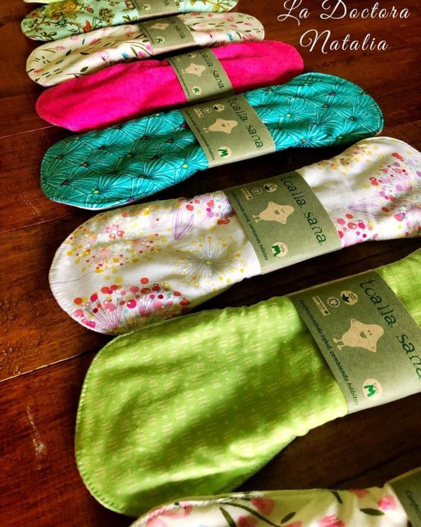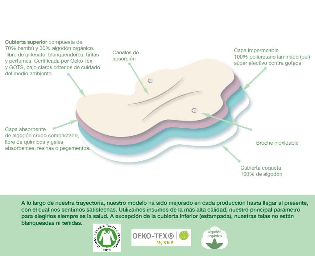 Cubierta superior compuesta de 70% bamboo y 30% algodón orgánico con canales de absorción, capa absorbente de algodón crudo compactado libre de geles absorbentes resinas o pegamentos.