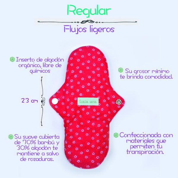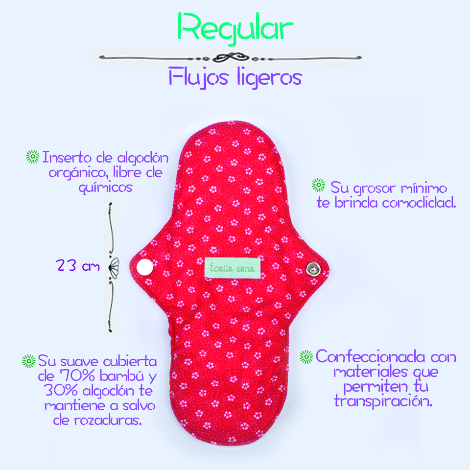 Cubierta superior compuesta de 70% bamboo y 30% algodón orgánico con canales de absorción, capa absorbente de algodón crudo compactado libre de geles absorbentes resinas o pegamentos.